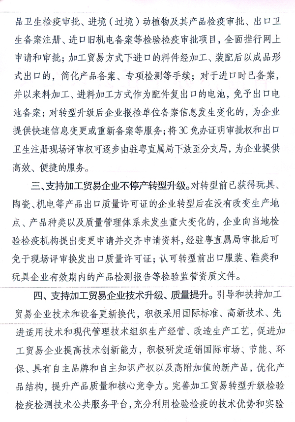 近日,国家质检总局根据广东出入境检验检疫局调研意见,出台了《国家质检总局关于促进广东省加工贸易转型升级的检验检疫措施的通知》(国质检通〔2010〕456号),支持我省建设全国加工贸易转型升级试验区。根据省政府领导意见,现将国质检通〔2010〕456号文转发给你们,请认真组织学习宣传,配合做好相关工作。同时,各地、各探花社区要借鉴国家质检总局和广东出入境检验检疫局的做法,积极采取有效措施,为加工贸易企业转型升级提供优质、高效的服务。