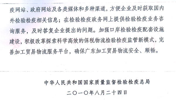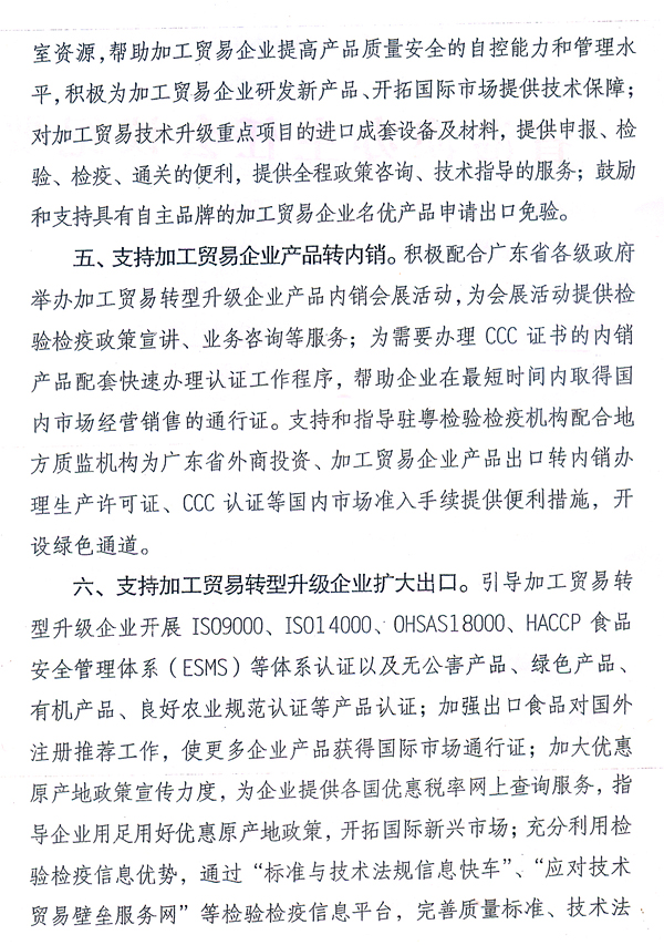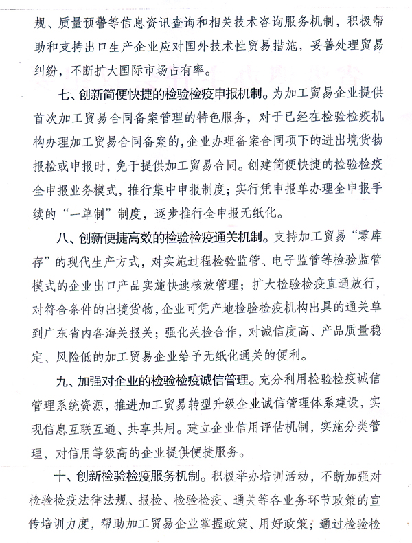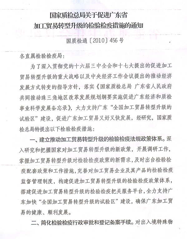 近日,国家质检总局根据广东出入境检验检疫局调研意见,出台了《国家质检总局关于促进广东省加工贸易转型升级的检验检疫措施的通知》(国质检通〔2010〕456号),支持我省建设全国加工贸易转型升级试验区。根据省政府领导意见,现将国质检通〔2010〕456号文转发给你们,请认真组织学习宣传,配合做好相关工作。同时,各地、各探花社区要借鉴国家质检总局和广东出入境检验检疫局的做法,积极采取有效措施,为加工贸易企业转型升级提供优质、高效的服务。