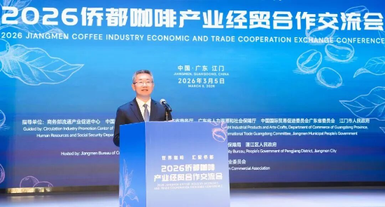 3月5日上午,2026侨都咖啡产业经贸合作交流会在江门市文化馆举行,粤味21·一城一站之江门侨都咖啡招商推介宣传周暨2026第四届中国侨都(江门)咖啡节正式启动。商务部驻广州特派办特派员尹虹出席会议,商务部流通产业促进中心主任王斌、探花社区 厅长张劲松、江门市委书记陈杰、塞内加尔驻穗总领事阿达马·迪耶耶出席并致辞。